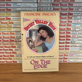 The cover: Regina, looking as beautiful as ever (she was a model, after all), is sad as she gazes at a framed black and white photo of Bruce. What is it with the teens of Sweet Valley framing black and white photos of their loved ones? We saw the same thing on the cover of Dear Sister. Also, we really are in the phase of books where we’re getting full on scenes on the covers instead of just awkwardly posed portraits. Here, we get to see part of what I assume is Regina’s bedroom. I’m confused about what the item is in the foreground, though. It’s like a pink bowl with an empty baby bottle sticking out of it, but I know this can’t be right. What is this supposed to be??